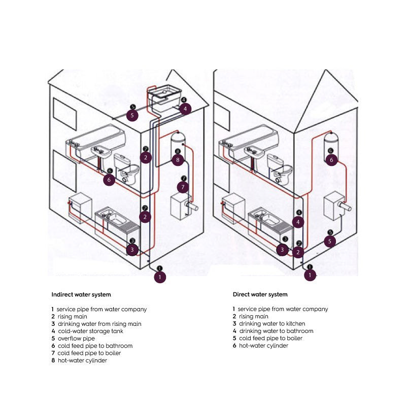 The indirect system has a degree of flexibility. If the mains are turned off, or pressure is low for example, there is a stored supply of water to run off until mains flow is returned. In addition, indirect systems are also quieter than their direct counterparts. These advantages don’t necessarily outweigh the significant disadvantages associated with the system. They’re much more expensive to install, suffer from the risk of contamination of stored water and can become complex and problematic when faced with higher demand.