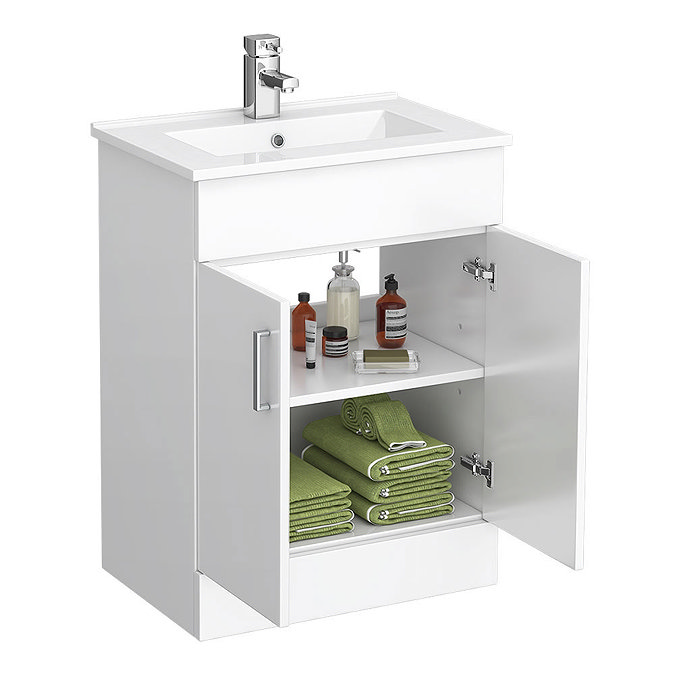 - Gloss white 2-door unit with soft-close hinges and chrome handles