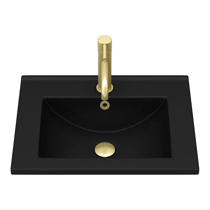 - Matt black slimline ceramic basin with an 18mm profile and brushed brass overflow