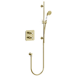 Burlington Guild Square Thermostatic 2 Outlet 2 Handle Shower Valve, Fixed Arm & Head, Holder & Handset with Hose & Outlet Elbow - Gold