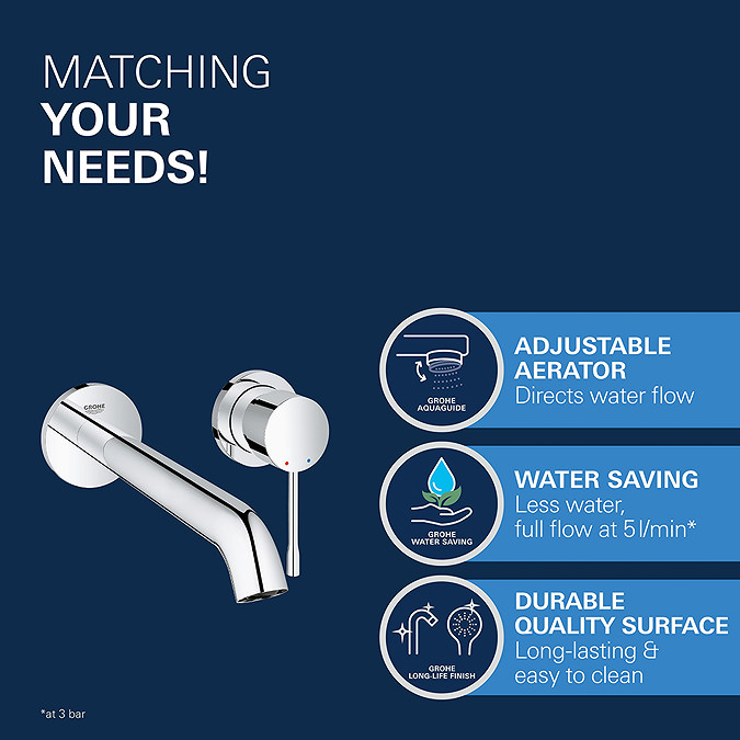The Essence wall mounted 2-hole basin mixer has an elegant, subtle design that will be a real highlight in your bathroom. This L-Size version features a 230mm spout for maximum comfort in your daily bathroom routines. The tap features an easy to use metal lever and GROHE EcoJoy which reduces water consumption by up to 50% without compromising on performance. The spray angle of the spout can be adjusted precisely with the integrated GROHE AquaGuide.