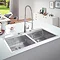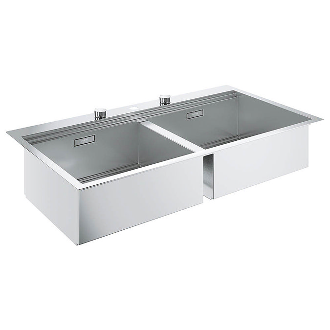 The GROHE K800 double bowl stainless steel sink is a generous, hard-wearing addition to any busy kitchen. It's double bowl design comfortably fits large pans and plates easily. Designed to be flush mounted for a seamless look with your worktop. The sink is made from durable GROHE StarLight AISI 304 grade stainless steel and features deep bowls that can comfortably fit large pans. GROHE Whisper insulation on the underside reduces noise, and the automatic waste fitting with remote control means you never have to reach into dirty water to pull the plug.